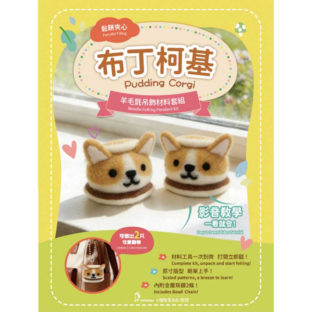鬆餅夾心羊毛氈材料包套組:布丁柯基(一包二隻,附金屬珠鍊,全程影音教學)