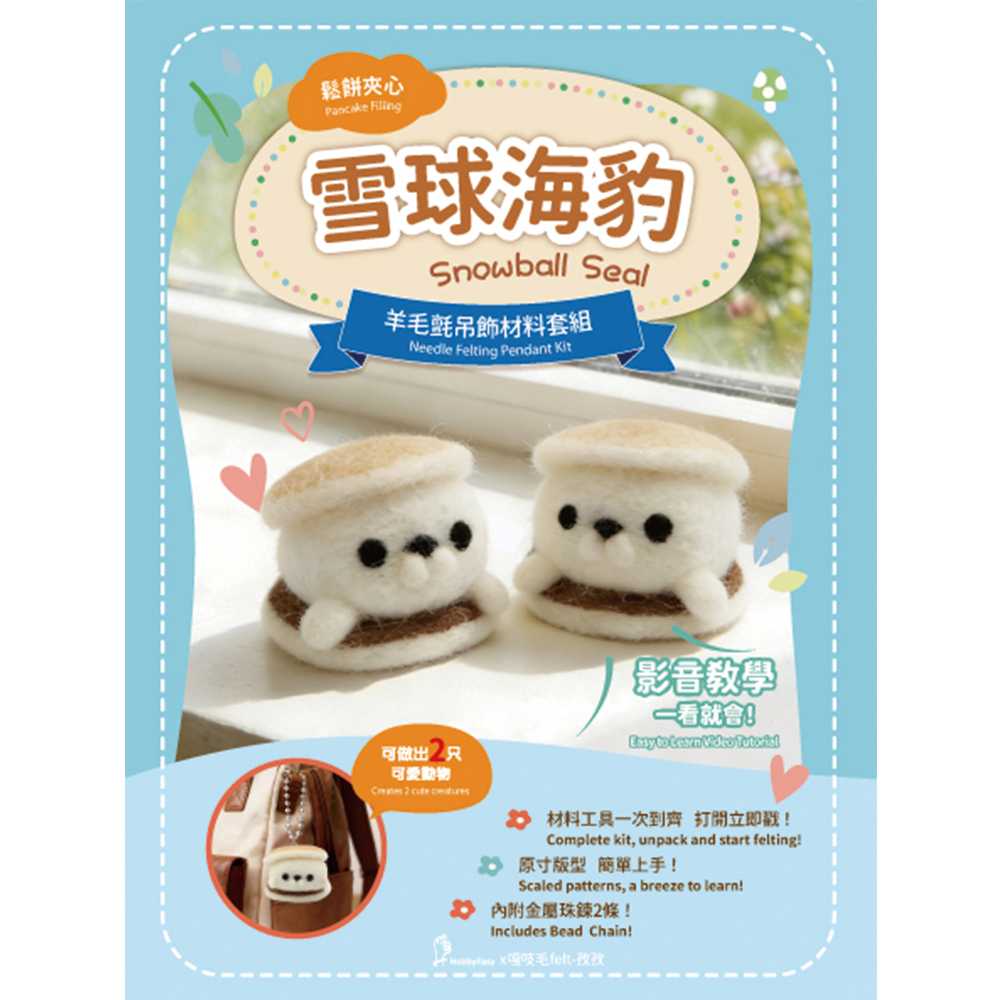 鬆餅夾心羊毛氈材料包套組:雪球海豹(一包二隻,附金屬珠鍊,全程影音教學)