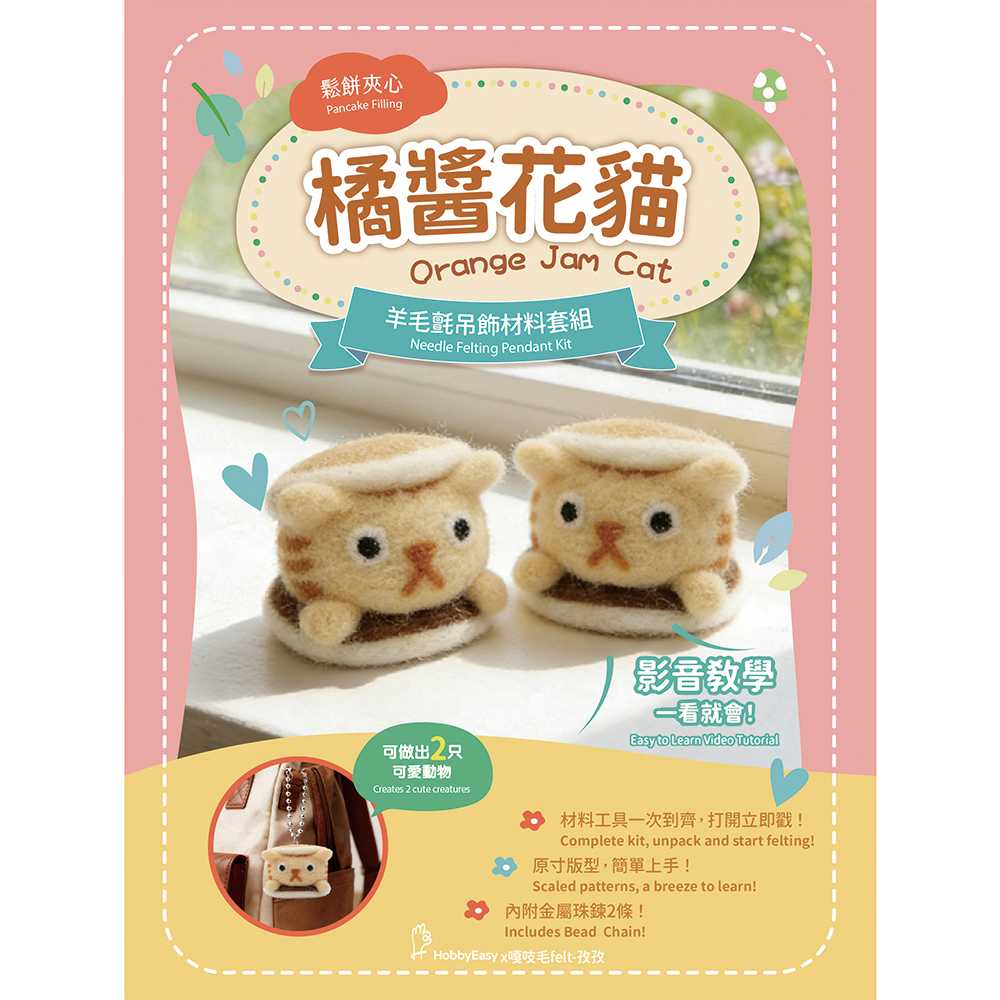 鬆餅夾心羊毛氈材料包套組:橘醬花貓(一包二隻,附金屬珠鍊,全程影音教學)